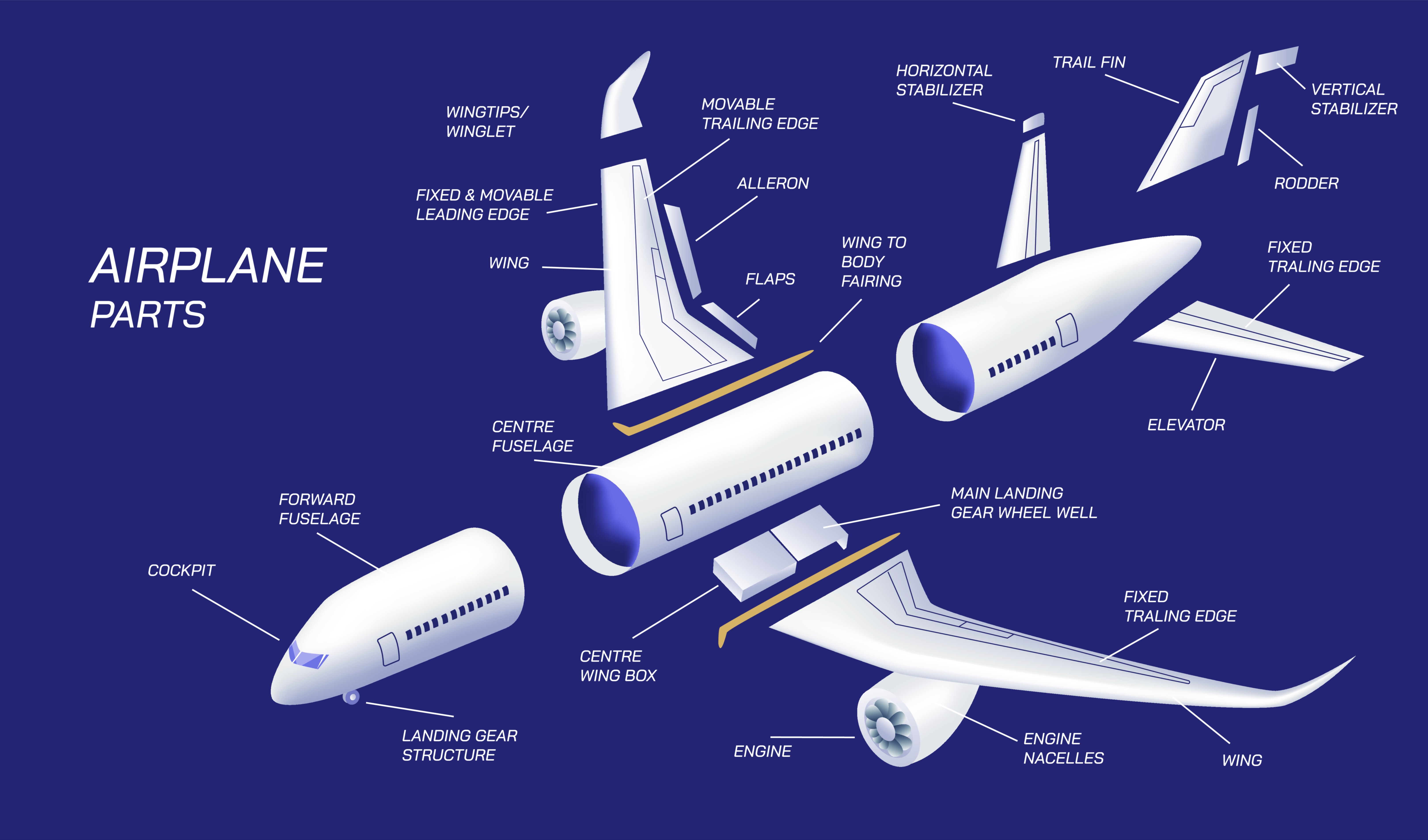 The structure of an airplane is a harmonious integration of mechanical, aerodynamic, and structural systems that together allow a machine to fly, maneuver, and transport passengers or cargo safely through the sky. Every part of an aircraft serves a specific purpose, contributing either to lift generation, stability, propulsion, control, safety, or the structural integrity needed to withstand aerodynamic forces. While all airplanes share common foundational components, their design and configuration vary depending on mission requirements, speed range, operational environment, and performance demands. A vector illustration showing aircraft parts typically provides a clear visual breakdown of how these components fit together, helping viewers understand the essential construction of a modern airplane. From nose cone to tail assembly, and from landing gear to wings, each component reflects decades of engineering evolution that balances strength, efficiency, aerodynamics, and safety. Understanding how these parts interact offers a window into the sophisticated science behind aviation and the remarkable engineering that enables sustained, controlled human flight.