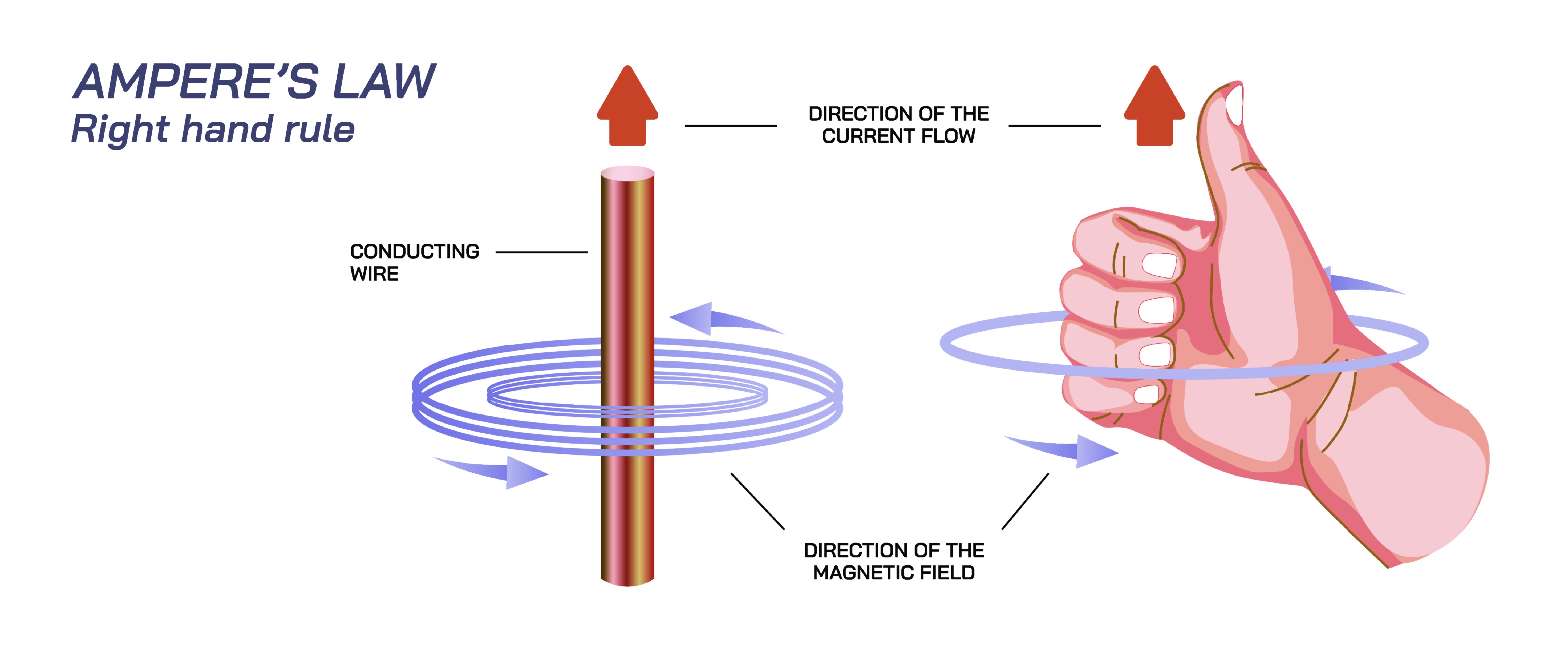 When a steady current flows through a long, straight conductor, the magnetic field that forms around it organizes itself into circular loops. These loops are centered on the wire, lying in planes perpendicular to the conductor. The direction of the magnetic field around the wire is determined by the right-hand rule: if you wrap the fingers of your right hand around the wire in the direction of the magnetic field, your thumb points in the direction of the electric current. This intuitive relationship between current flow and magnetic field circulation is one of the most accessible demonstrations of Ampere’s Law in real-world physics. A vector illustration often presents these field lines as evenly spaced circles around the wire, with arrows showing the direction of rotation. This graphical depiction highlights the elegance of electromagnetic symmetry, where electric movement naturally produces organized, circular magnetic patterns—patterns that form the basis of countless electrical technologies.