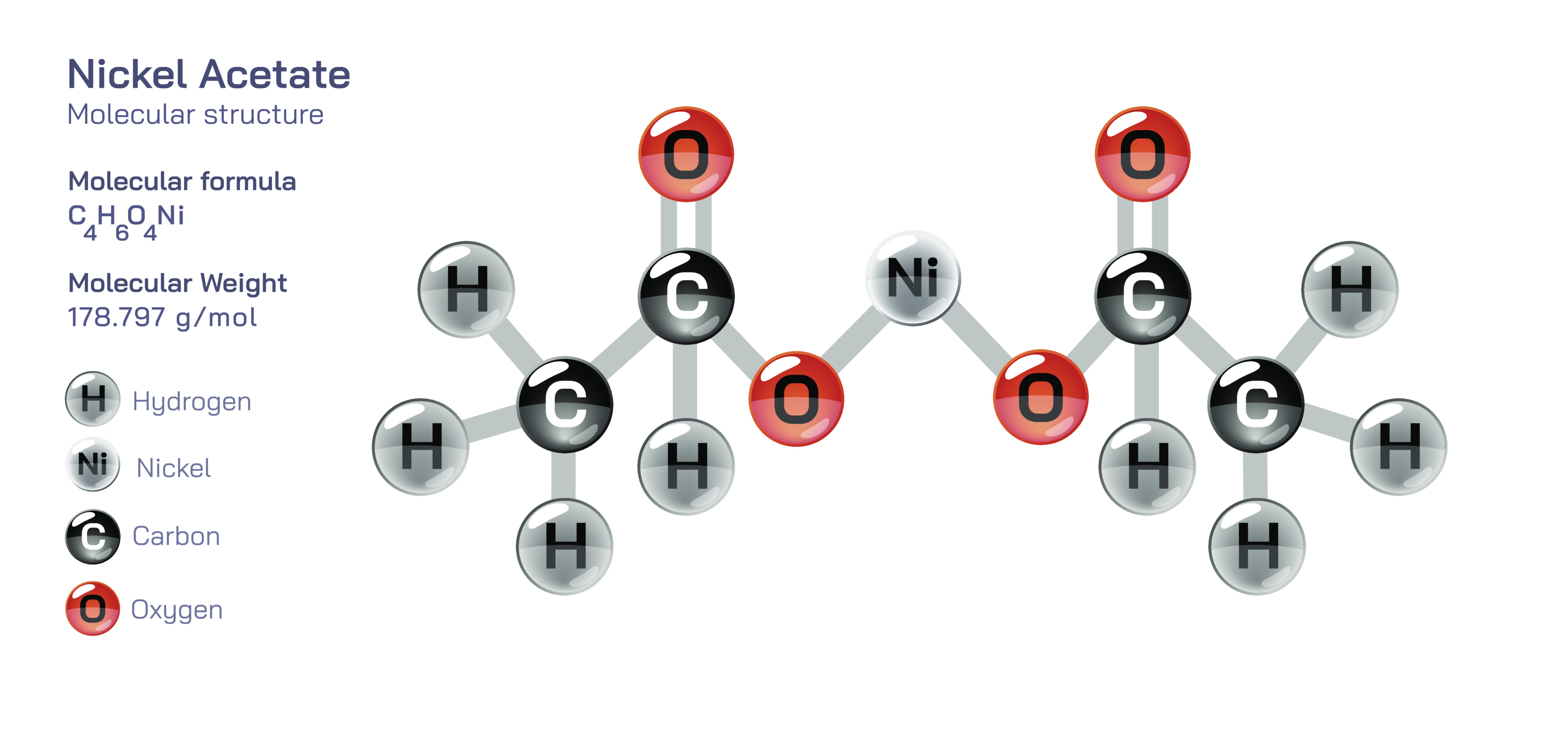 Nickel acetate is a coordination compound in which nickel ions are bonded with acetate ligands, and its molecular structure is the reason it plays such an important role in electroplating, surface finishing, materials science, catalytic synthesis, ceramics, textile processing, and numerous industrial chemical systems. At its core, nickel acetate contains a divalent nickel cation (Ni²⁺) associated with two acetate anions derived from acetic acid, forming a stable chelated complex in which the oxygen atoms of the carboxylate groups act as electron-pair donors that coordinate to the nickel center. In its most common commercial and laboratory form, nickel acetate is encountered as nickel(II) acetate tetrahydrate, a crystalline green compound in which four water molecules integrate into the coordination sphere without altering the essential nickel–acetate bonding network. This structure explains its solubility in water and polar solvents, its moderate thermal stability, and its predictable dissociation behavior. When a vector illustration of nickel acetate is produced, the acetate groups appear as functional units containing a methyl group linked to a carboxylate moiety, while the nickel ion sits at the center of an octahedral coordination field surrounded by oxygen donors from acetate and water molecules. This visual representation captures the fundamental concept that the nickel ion remains accessible within a coordination environment, which determines how the compound behaves when dissolved, heated, or used in reactions that involve ligand exchange or controlled deposition of nickel.