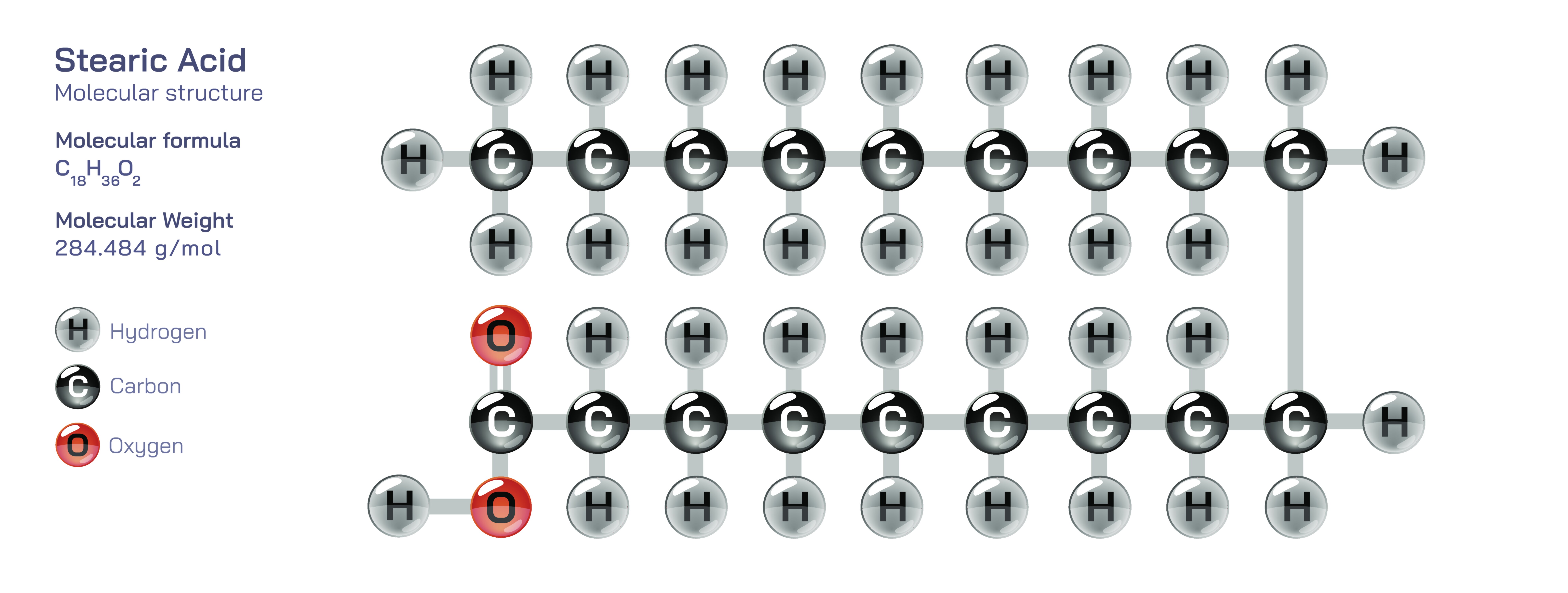 Stearic acid offers an exemplary gateway into understanding organic molecules because its structure, reactions, and physical properties give students a clear view of how the arrangement of atoms influences the behavior of matter on both microscopic and macroscopic scales. Represented by the molecular formula C₁₈H₃₆O₂, stearic acid belongs to the family of long-chain saturated fatty acids, and its chain contains eighteen carbon atoms bonded in a continuous, unbranched sequence. The molecule ends in a carboxylic acid functional group, which is responsible for its chemical reactivity, while the long hydrocarbon tail contributes to its hydrophobic nature and its solid, waxlike character at room temperature. When learners visualize stearic acid on a molecular level, they often recognize that a molecule can possess two distinct personality regions: one that is polar and chemically active—represented by the carboxyl (-COOH) group—and one that is nonpolar and largely inert, represented by the long alkyl chain. This dual character illustrates an essential organic chemistry concept: physical and chemical behavior depend on the balance between functional groups and hydrocarbon structure. In the case of stearic acid, the dominance of nonpolar carbons and hydrogens explains why it is insoluble in water yet readily soluble in organic solvents, and it also explains why it assumes a solid form at relatively low temperatures compared with unsaturated fatty acids that possess double bonds.