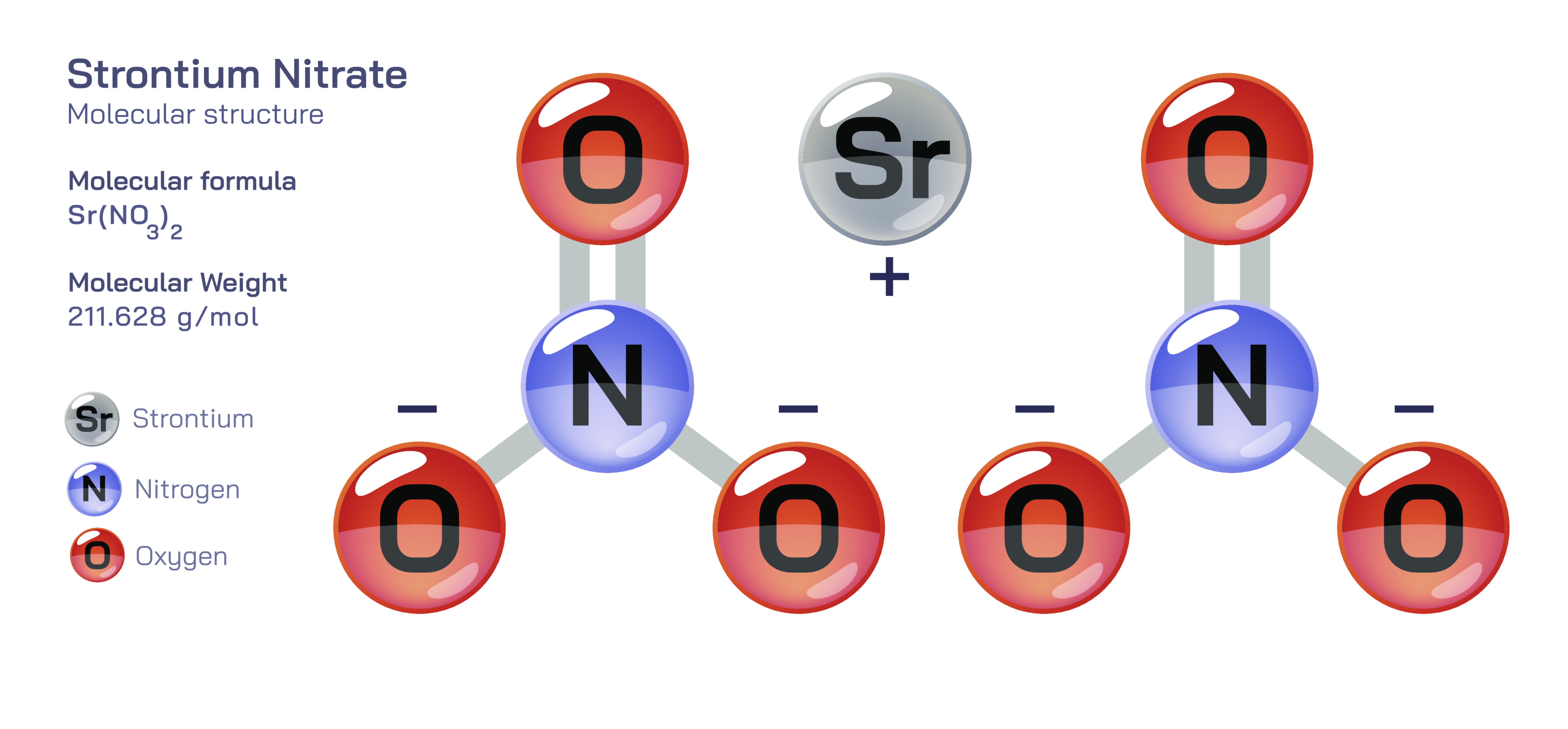 Even though the chemical formula looks compact, the bonding within strontium nitrate has two distinct character types that help clarify the difference between ionic and covalent interactions. Within each nitrate ion, nitrogen and oxygen atoms are held together by covalent bonds in which electrons are shared internally among the atoms. However, the nitrate ion as a whole does not form a covalent bond with the strontium ion. Instead, nitrate ions and strontium ions interact through electrostatic ionic attraction. This dual nature—covalent bonding inside the polyatomic ion and ionic bonding between ions in the lattice—offers an important instructional opportunity. It demonstrates to students that the term “ionic compound” does not imply that all bonds inside the structure are ionic; instead, ionic compounds often contain internal covalent units embedded in a larger ionic lattice. The nitrate group behaves like a discrete charged cluster, maintaining its internal structure even when the compound dissolves or reacts, further reinforcing the stability of resonance-stabilized polyatomic ions.