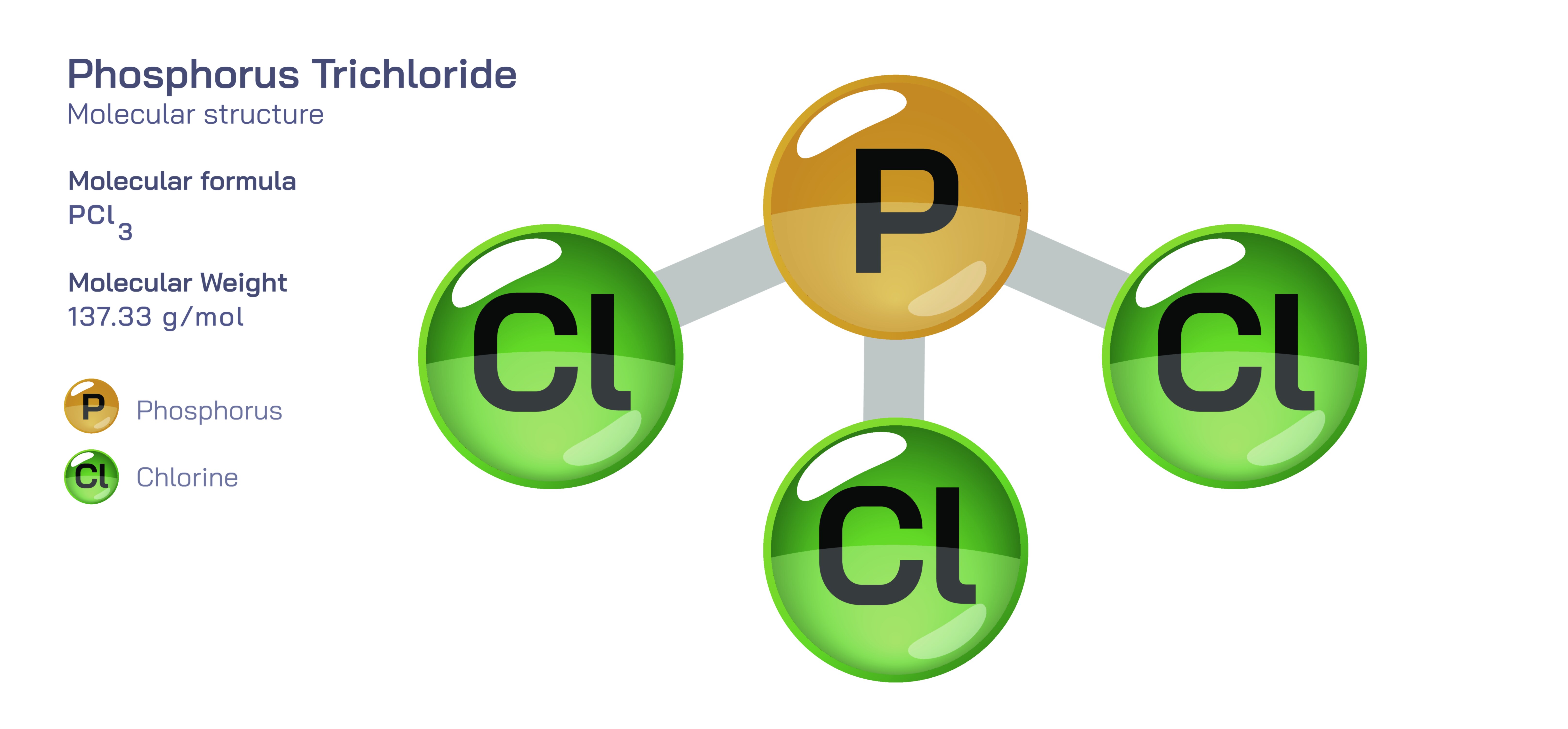 Phosphorus trichloride is one of the most strategically important inorganic compounds in the global chemical industry because its structure allows it to act as a reactive precursor for countless phosphorus-containing materials, fertilizers, pharmaceuticals, plastics, pesticides, flame retardants, additives, and specialty chemicals. The molecule’s formula is PCl₃, meaning it contains one phosphorus atom covalently bonded to three chlorine atoms. At the structural level, phosphorus trichloride has a trigonal pyramidal geometry: three chlorine atoms occupy three corners of a triangular base, while phosphorus sits at the apex with a lone electron pair that pushes the P–Cl bonds downward. This lone pair contributes strongly to the molecule’s reactivity by making the phosphorus electrophilic and susceptible to nucleophilic attack, while the chlorine atoms act as leaving groups during substitution or hydrolysis reactions. The result is a molecule that behaves as a controlled chlorinating agent, a ligand for metal coordination, and a gateway to derivative compounds such as phosphites, phosphonates, and phosphates. Even though the structure appears simple, the electronic properties arising from P–Cl polarity and phosphorus’s empty d-orbitals give phosphorus trichloride an immense chemical influence — a fact that explains why it is considered a “building block chemical” in industrial production.