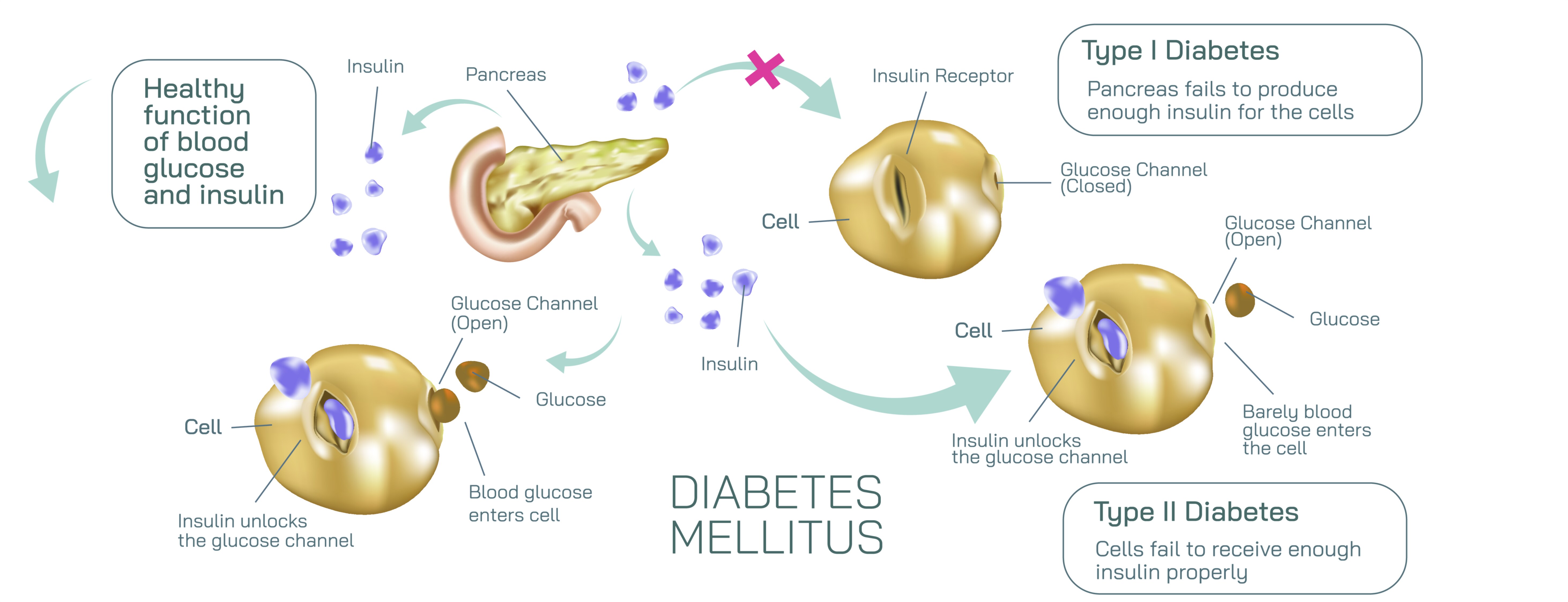 • Clear arrows showing whether glucose enters the cells (healthy), remains trapped (Type 1), or is partially resisted (Type 2).