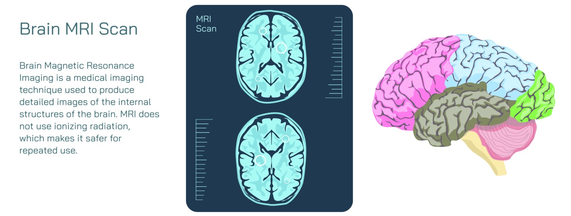 Brain MRI Scan Illustration: Cross-Section Imaging Showing Brain Structures and Pathologies
