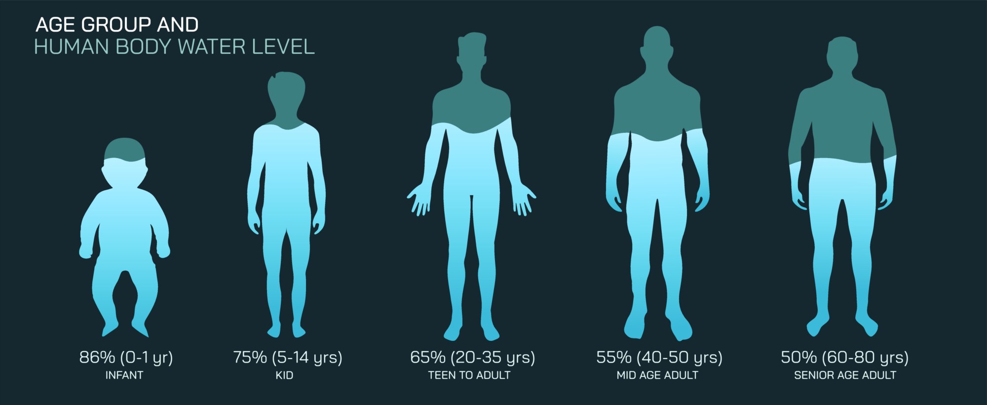 Human Age Groups and Body Water Percentage Illustration: Development and Hydration Levels Explained