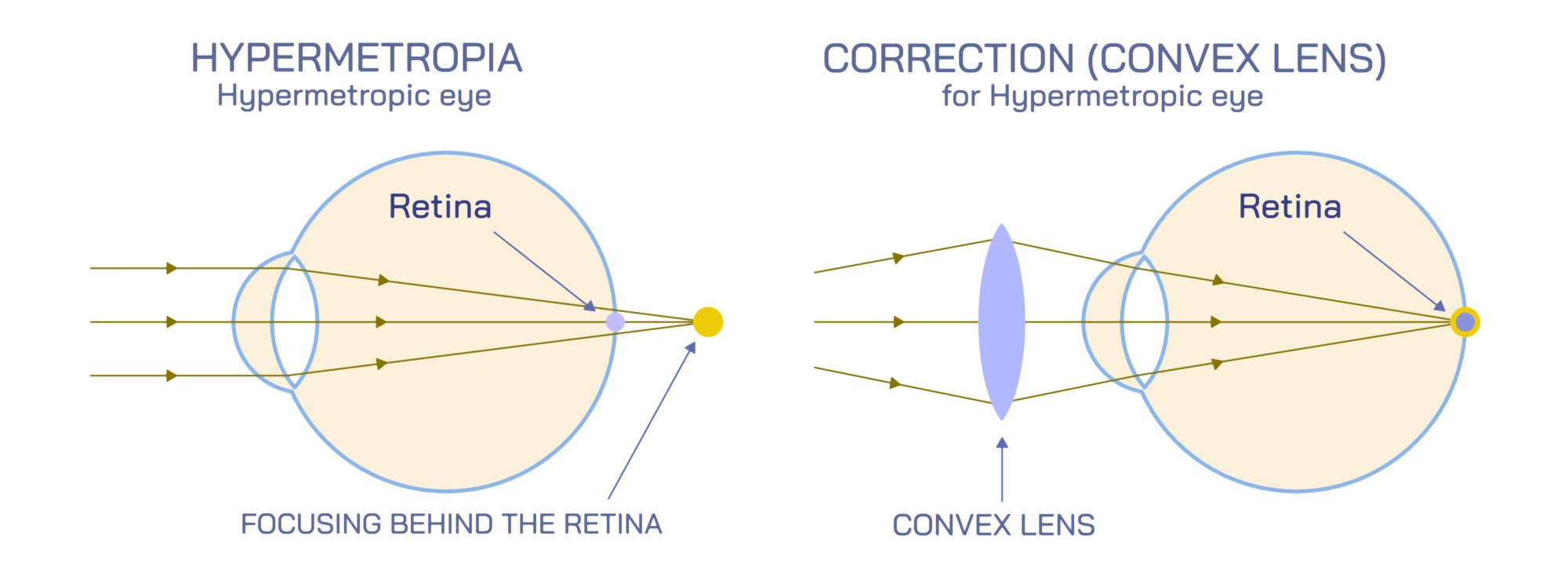 In hypermetropia (hyperopia or farsightedness), the eye focuses light behind the retina. This defect usually occurs because the eyeball is too short, or the cornea has insufficient curvature, giving the eye too little refractive power. The illustrated light-path of a hypermetropic eye shows rays entering and remaining slightly unfocused, converging at a point beyond the retinal surface. As a result, near objects appear blurry, especially when focusing demands exceed the eye’s accommodation abilities. Distant objects are often seen clearly, at least in younger individuals, because the lens can adjust shape to increase focusing power. Illustrations also often include a depiction of the ciliary muscles working harder to thicken the lens for near focus, explaining why people with untreated hypermetropia experience headaches, eye strain, and visual fatigue when reading or doing close work. Corrective visuals show convex (plus/+) lenses, which converge light slightly before it enters the eye so that the retina becomes the true focal plane.