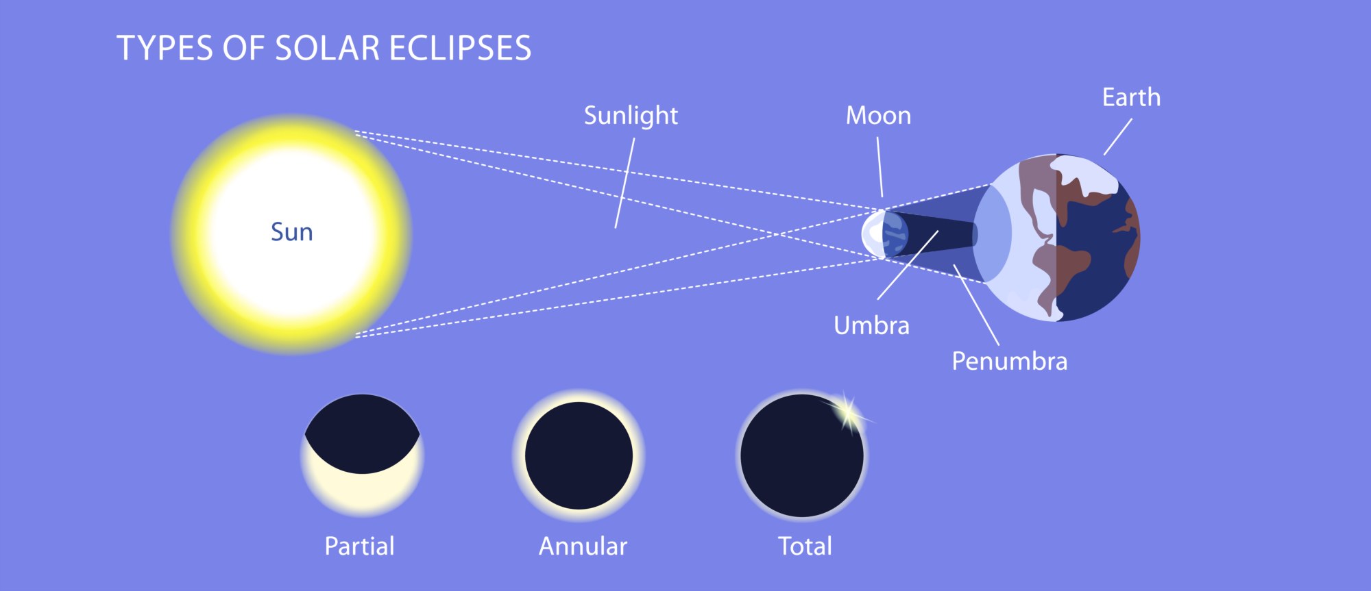 Solar eclipses occur in several distinct types, depending on the relative distances of the Sun, Moon, and Earth: