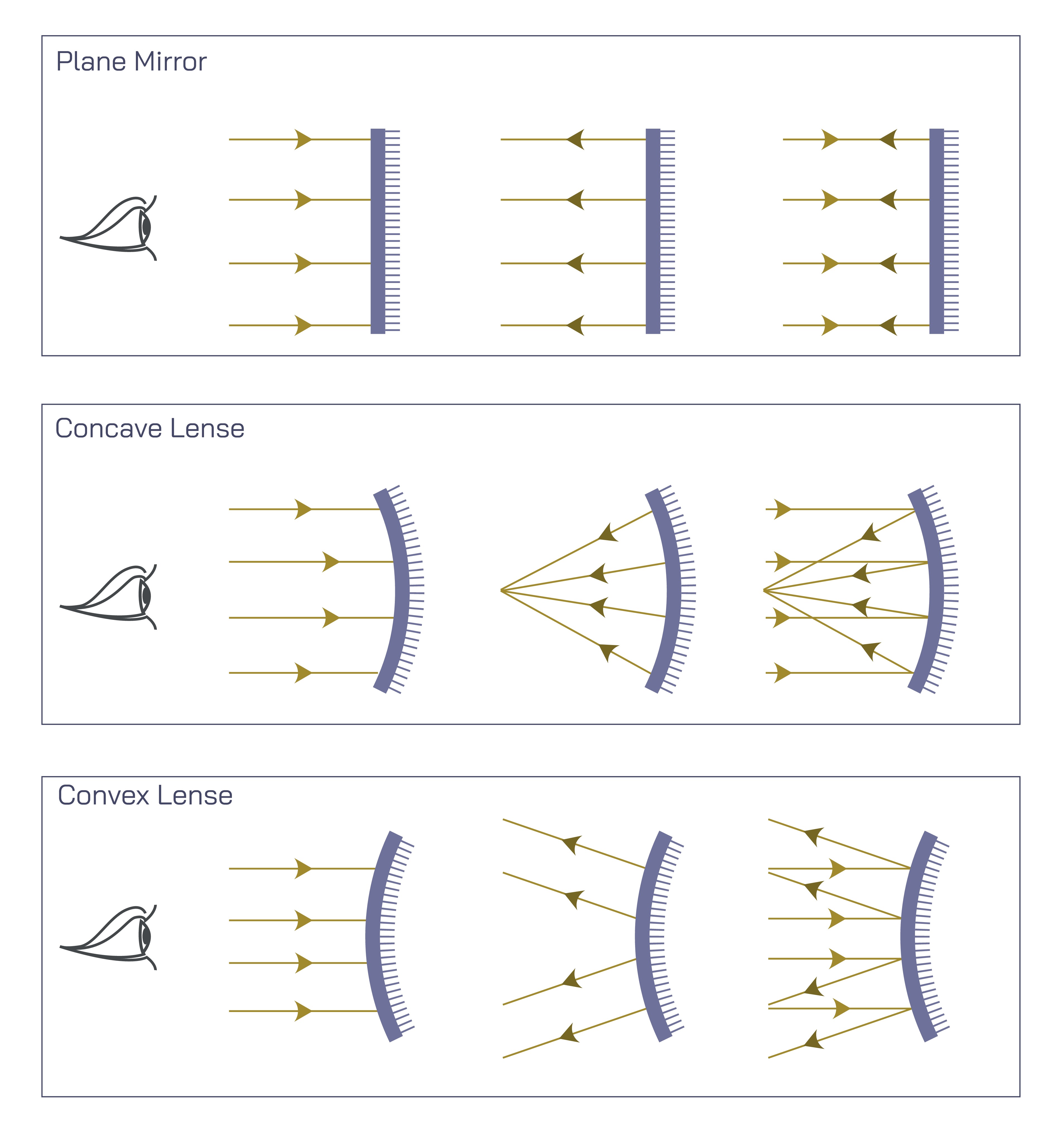 Plane mirrors preserve the direction and distance of light rays without altering their spacing. Concave mirrors bend rays inward, focusing or magnifying images depending on object placement. Convex mirrors bend rays outward, reducing image size but expanding the visible area. These differences arise directly from the curvature of the reflective surface and determine how each mirror type is used in practical settings. Understanding these behaviors allows for intelligent application in engineering, physics, visualization tools, and everyday life.
