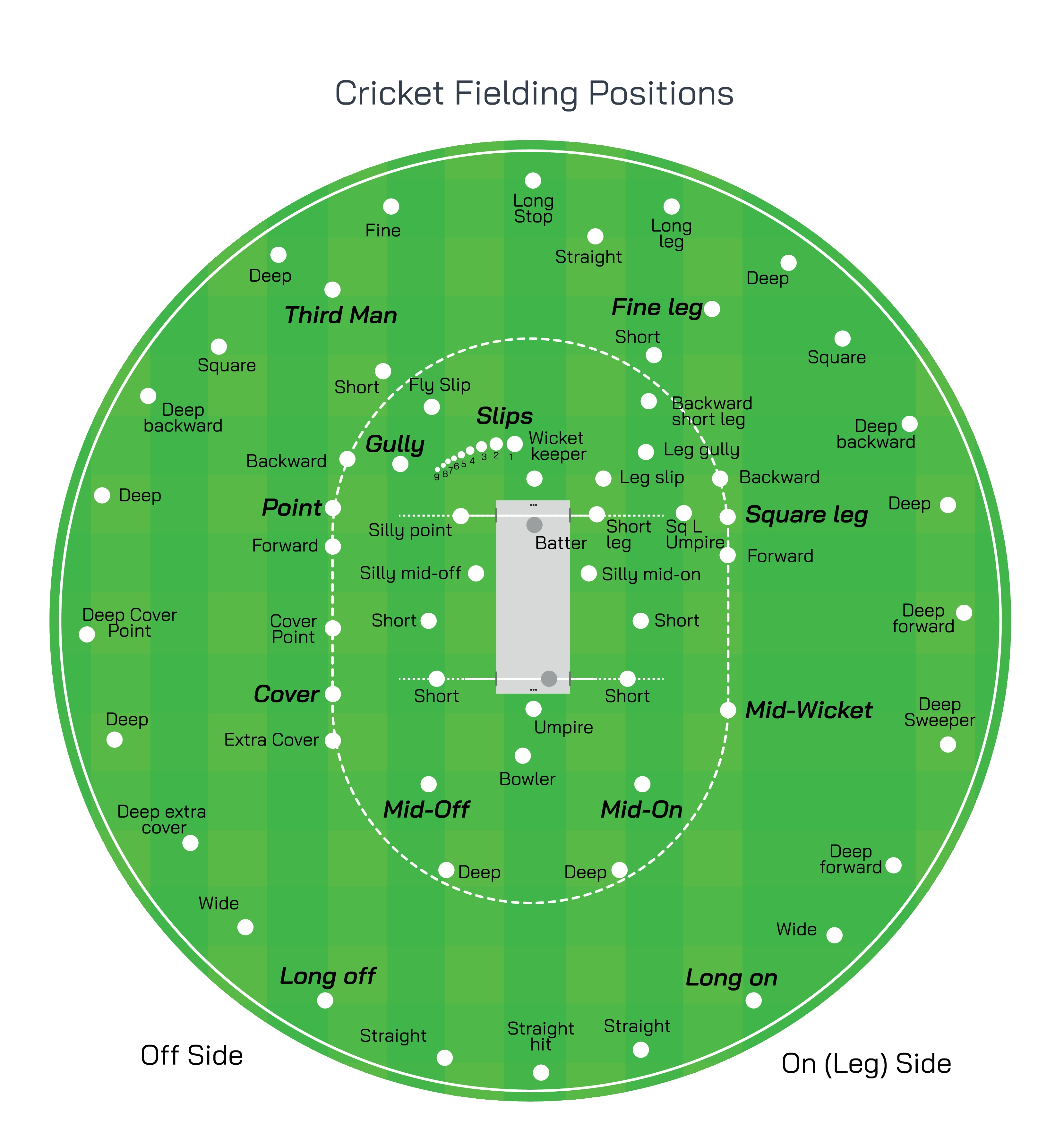 A cricket ground is broadly divided into two halves by an imaginary line running straight down the pitch in the direction the batter is facing. These halves are known as the off side and the leg side. The off side is the side of the field in front of the batter’s body, while the leg side, also called the on side, is behind the batter’s legs. All fielding positions are described with reference to this division, along with distance from the batter and angle from the pitch.