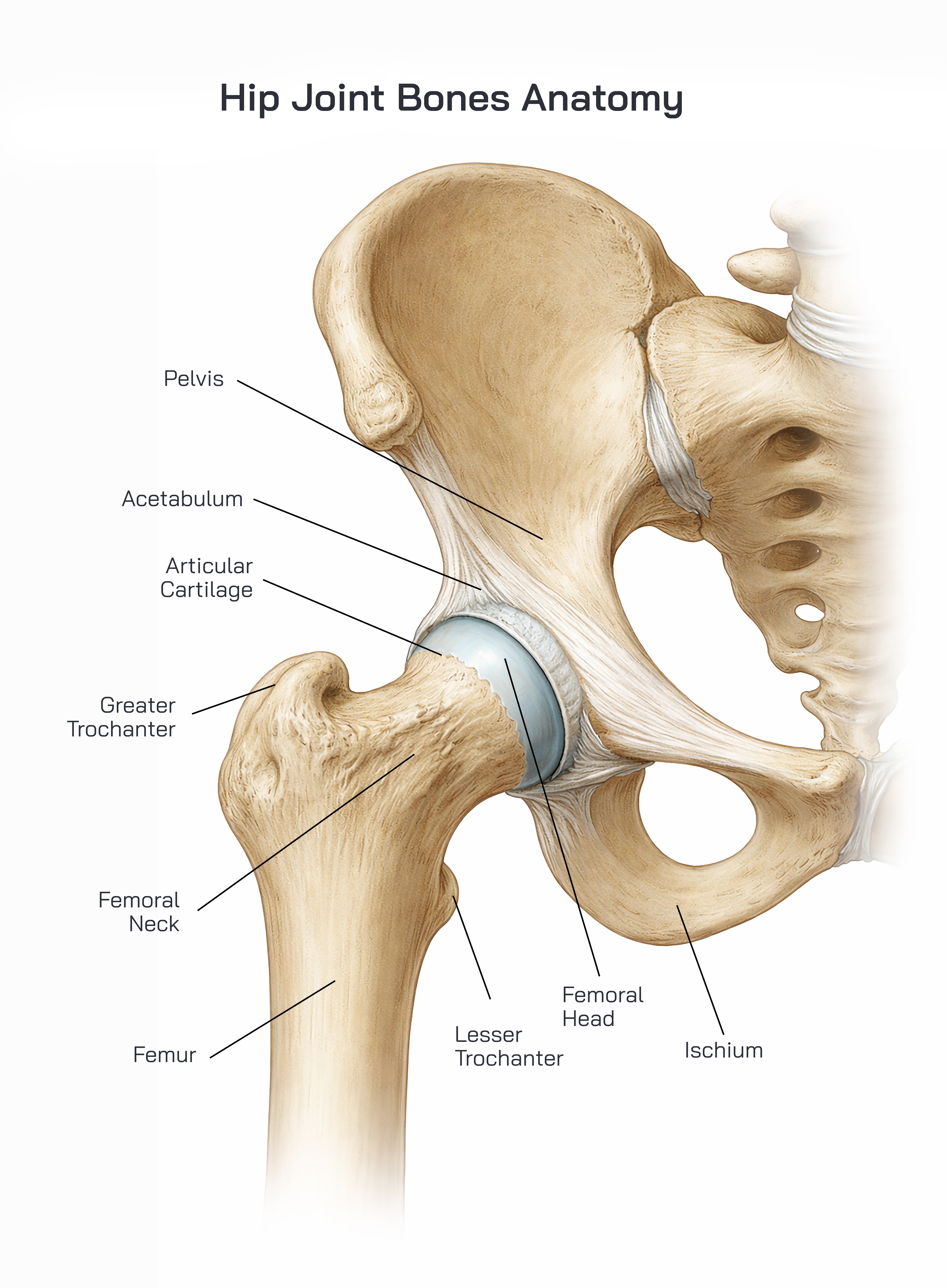 The acetabulum is a defining feature of hip joint bones anatomy and is specifically shaped to enhance joint stability. Its cup-like form partially encloses the femoral head, increasing the surface area of contact between the bones. This design reduces stress on any single point and minimizes wear on joint surfaces. The orientation of the acetabulum also plays a key role in guiding movement, ensuring that the femoral head remains centered during motion while allowing freedom in multiple directions.