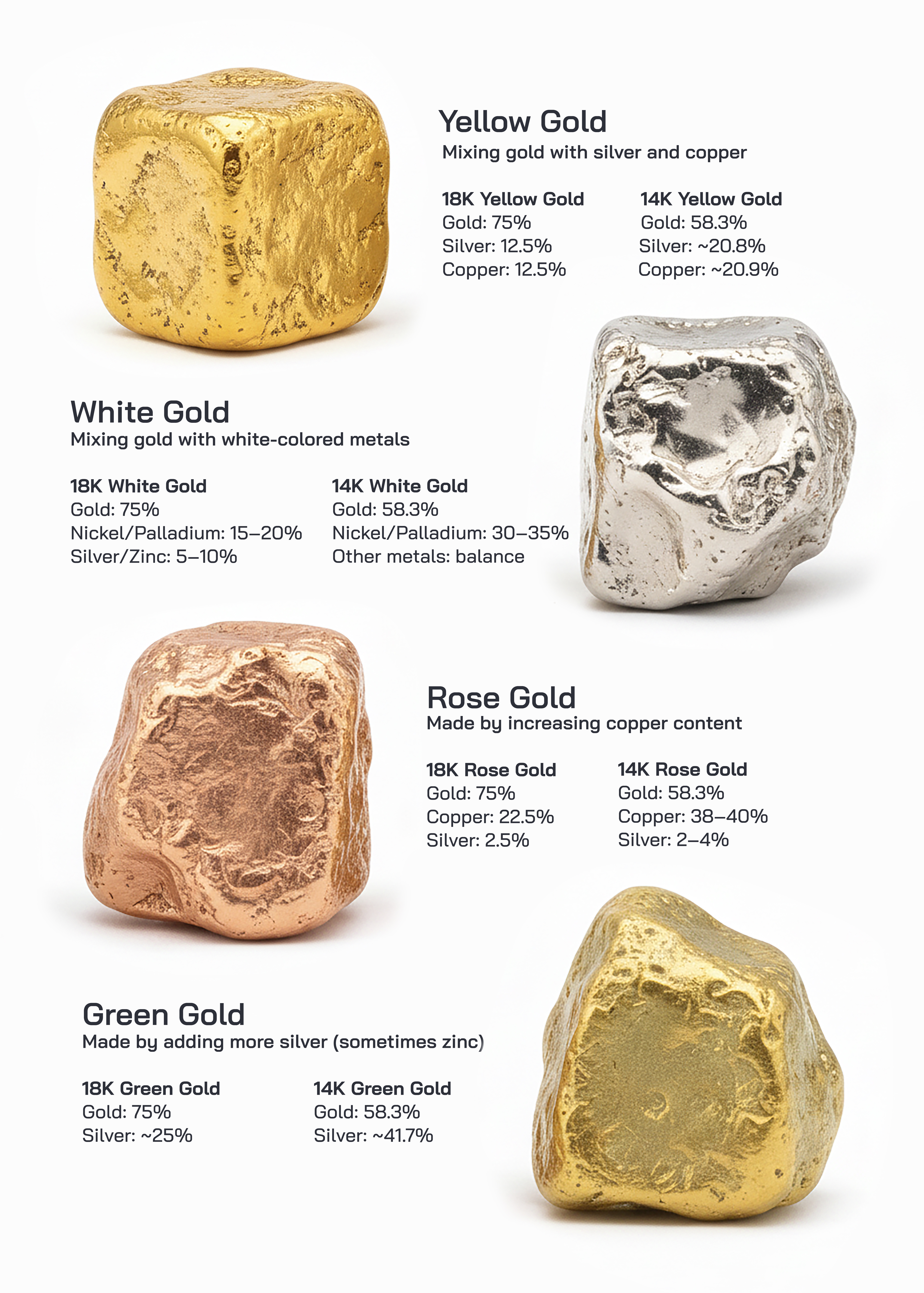 The differences between yellow, white, rose, and green gold are primarily determined by alloy composition rather than gold purity. Two pieces of jewelry with the same karat value can have identical gold content but very different colors and mechanical properties depending on the metals mixed with the gold. Yellow gold emphasizes balance and tradition, white gold focuses on modern aesthetics and gemstone enhancement, rose gold highlights warmth and durability, and green gold offers a unique, subtle color variation rooted in historical metallurgy.